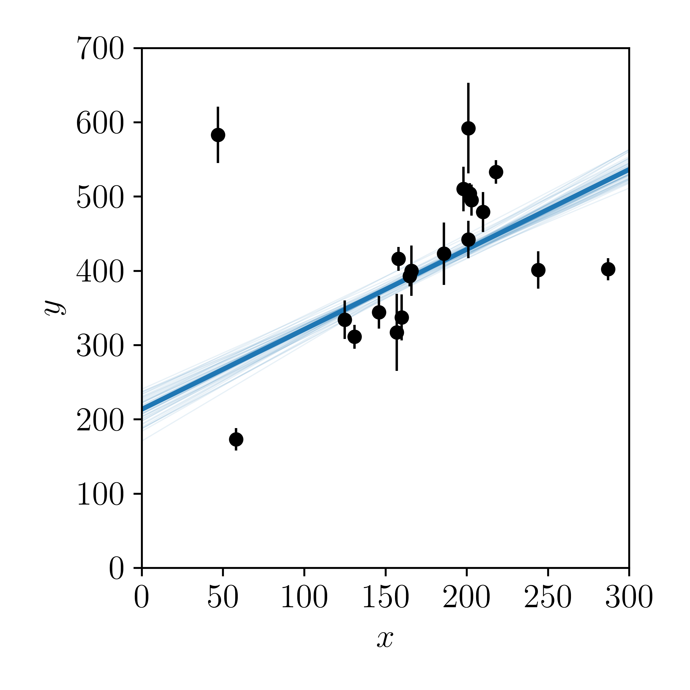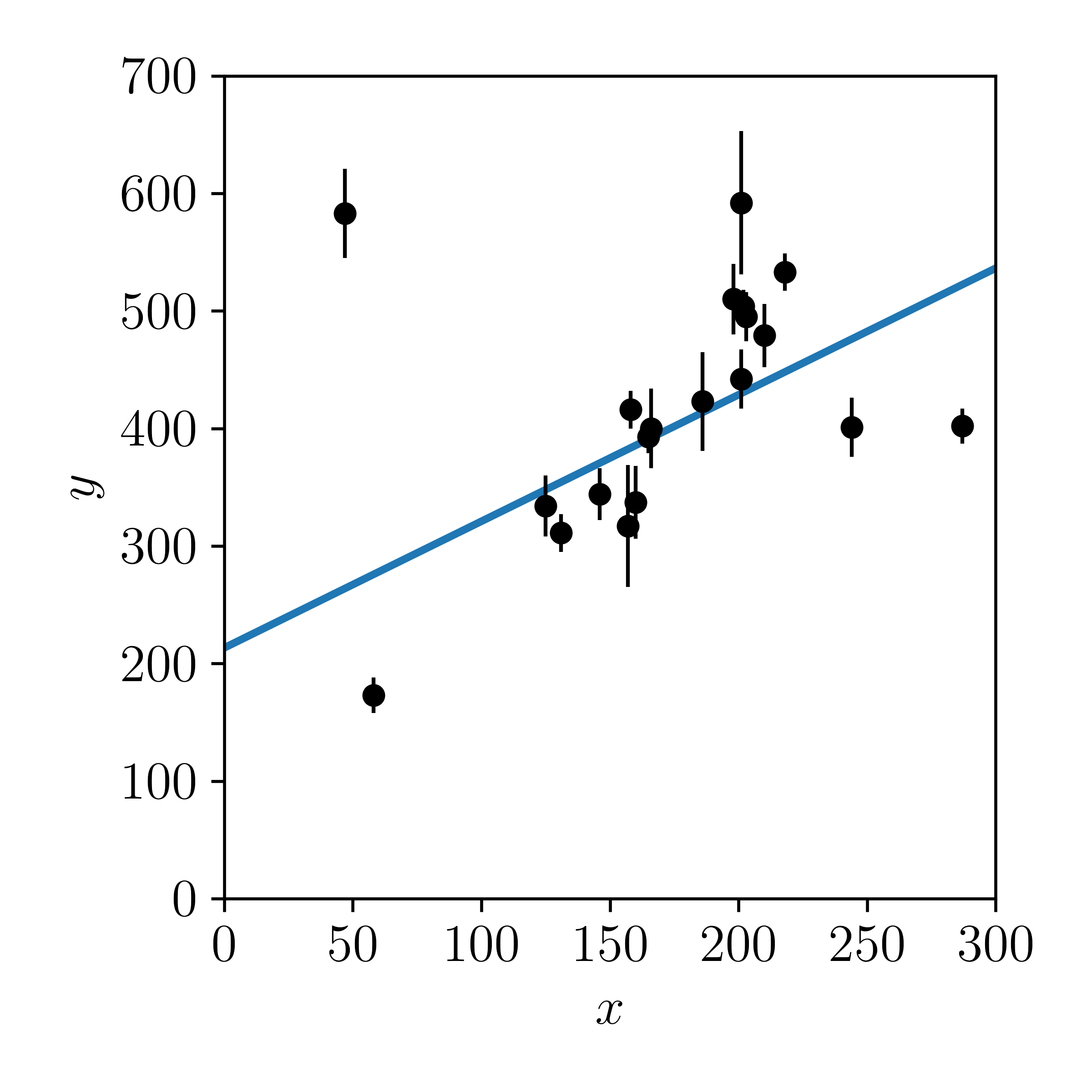 Or better yet: how do you think other people might (incorrectly) address this problem? You might assume that there is a straight line that relates \(x\) and \(y\). Someone might then assume that the point near \((x, y) = (50, 600)\) is not actually part of the data: it's a mistake, or an error, because it is an outlier. But what of some of the other points that are far away? When do you stop cutting outliers? And how do you account for the errors in each data point? Some have large errors in \(y\) but small errors in \(x\), do they count the same as large errors in \(x\) and small errors in \(y\)? Is a straight line good enough? Do we need some higher order polynomial to properly capture all the data points?