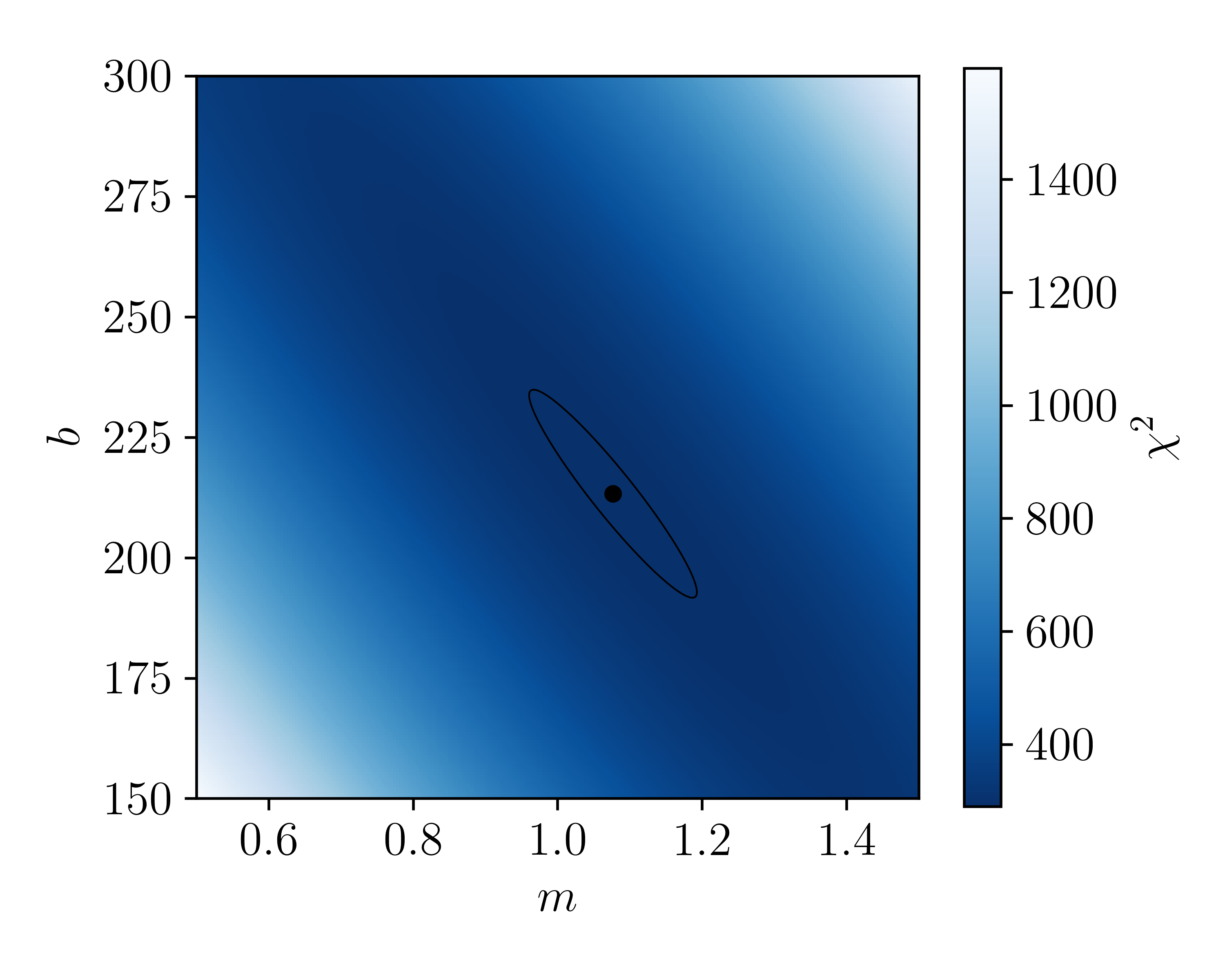 Well, that looks kind of reasonable. The minimum \(\chi^2\) value appears at about the point where we have plotted the result from linear algebra, and the ellipse showing the covariance matrix \(\left[\mathbf{A}\transpose\mathbf{C}^{-1}\mathbf{A}\right]^{-1}\) seems aligned with the valley of low \(\chi^2\) values. Are we done? What's unusual here?