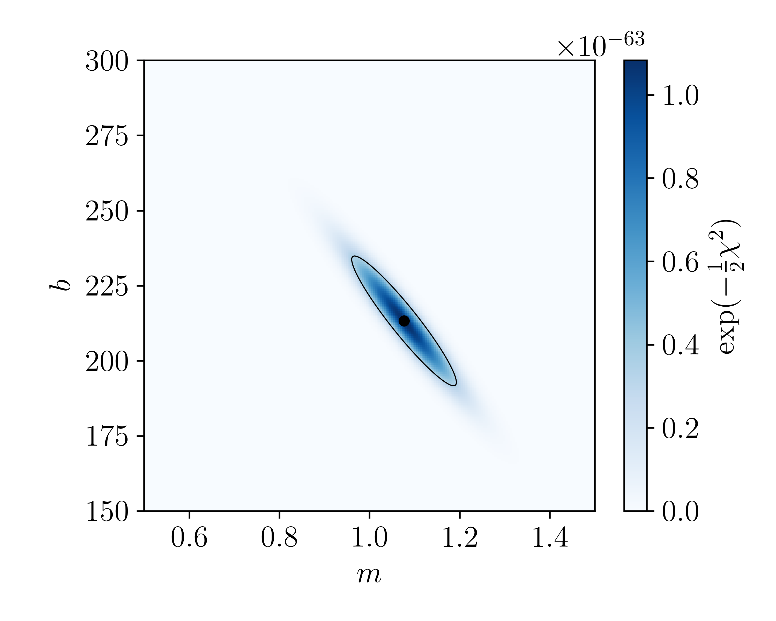 One thing to consider might be that valley, we just described. The valley in \(\chi^2\) seems to extend well beyond the plotting axes. If we naively plotted \(\chi^2\) contours like this, and if we didn't know that our formal uncertainties are given by \(\left[\mathbf{A}\transpose\mathbf{C}^{-1}\mathbf{A}\right]^{-1}\), we might think that the uncertainties in \(m\) and \(b\) are enormous! And from looking at the draws from the model, we might believe the two figures are consistent because the overall fit to the data is pretty poor. In practice, we are plotting slightly different things.