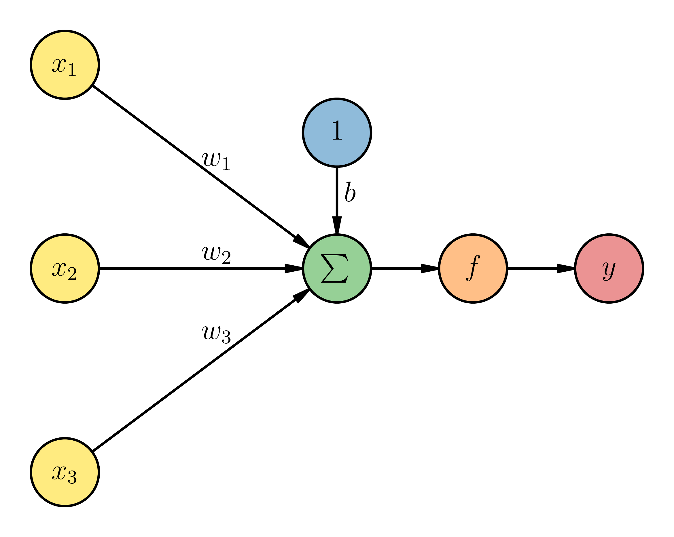 Consider what happens to the inputs of this neuron above, before the activation function. The input values \(\vec{x}\) are those from our training set for one observation. In other words, we are showing the three properties \((x_1, x_2, x_3)\) of one observation in the training set (\(D = 3\)). Each input value has an associated weight \(\vec{w}\) that we need to determine. You can see that we are also putting in a fake input value of 1, where we label the weight of that input as \(b\). The value we are providing to the activation function \({f}\) is then