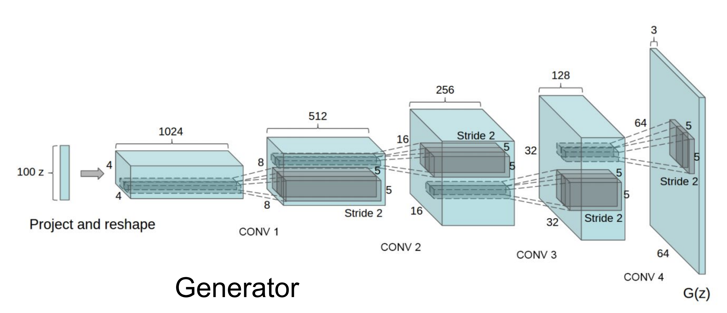 With this kind of architecture we will draw from a 100 dimensional unit normal distribution \(z\), which goes through a series of convolutional layers to predict a \(64\times{}64\) pixel image (4,096 size instead of 100). The end result is that random draws in \(z\) produce more photo-realistic images, and interpolating between places in \(z\) produce smooth — albeit unusual to look at — changes in the output images (e.g., from having desks in a room to having no desk, adding glasses on peoples' faces, et cetera).