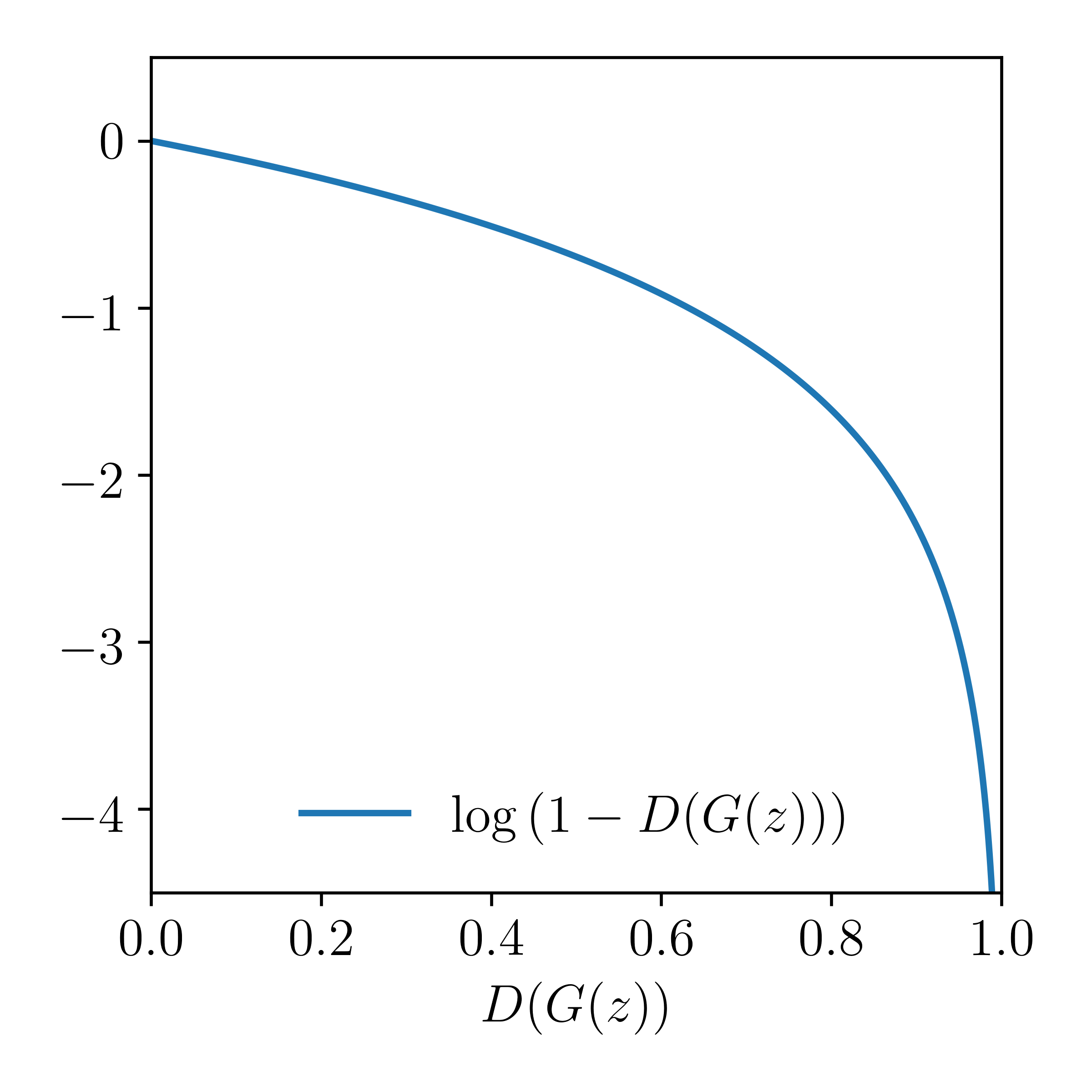 However when the sample \(D(G(z))\) is likely fake (e.g., \(D(G(z)) \approx 0\)) we want it to improve the generator, but the gradient of the generator function is relatively flat when \(D(G(z)) \approx 0\):