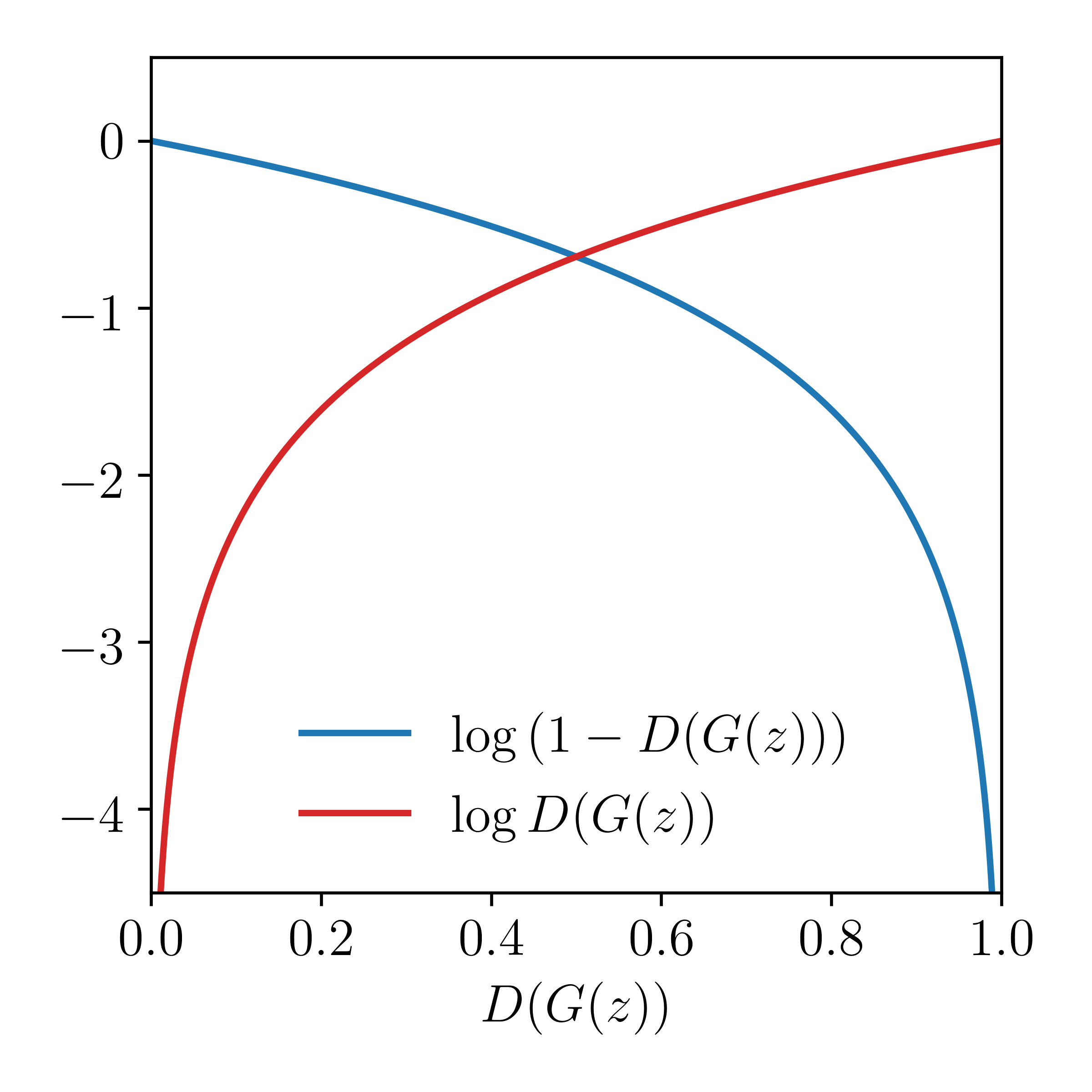 With these definitions the objective function for both networks is given by \[ \min_{\theta_g}\max_{\theta_d}\left[\mathop{\mathbb{E}}{}_{x\sim{}p_\textrm{data}} \log{D_{\theta_d}\left(x\right)} + \mathop{\mathbb{E}}{}_{z\sim{}p(z)}\log{\left(1-D_{\theta_d}\left(G_{\theta_g}\left(z\right)\right)\right)}\right] \] where it can be seen that the discriminator network \(D_{\theta_d}\) wants to maximize the objective such that \(D(x)\) is close to 1 (real) and \(D(G(z))\) is close to 0 (fake). It can also be seen that the generator \(G_{\theta_g}\) wants to minimize the objective such that \(D(G(z))\) is close to 1 (i.e., the discriminator is fooled into thinking that the image the generator produced is real).