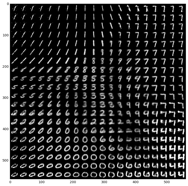 And if you draw samples in the latent space and look at the corresponding (mean) predictions from the decoder, you can see that the autoencoder has picked up on the salient features of each digit, and that the interpolation is smooth and continuous across the latent (and data) space.
