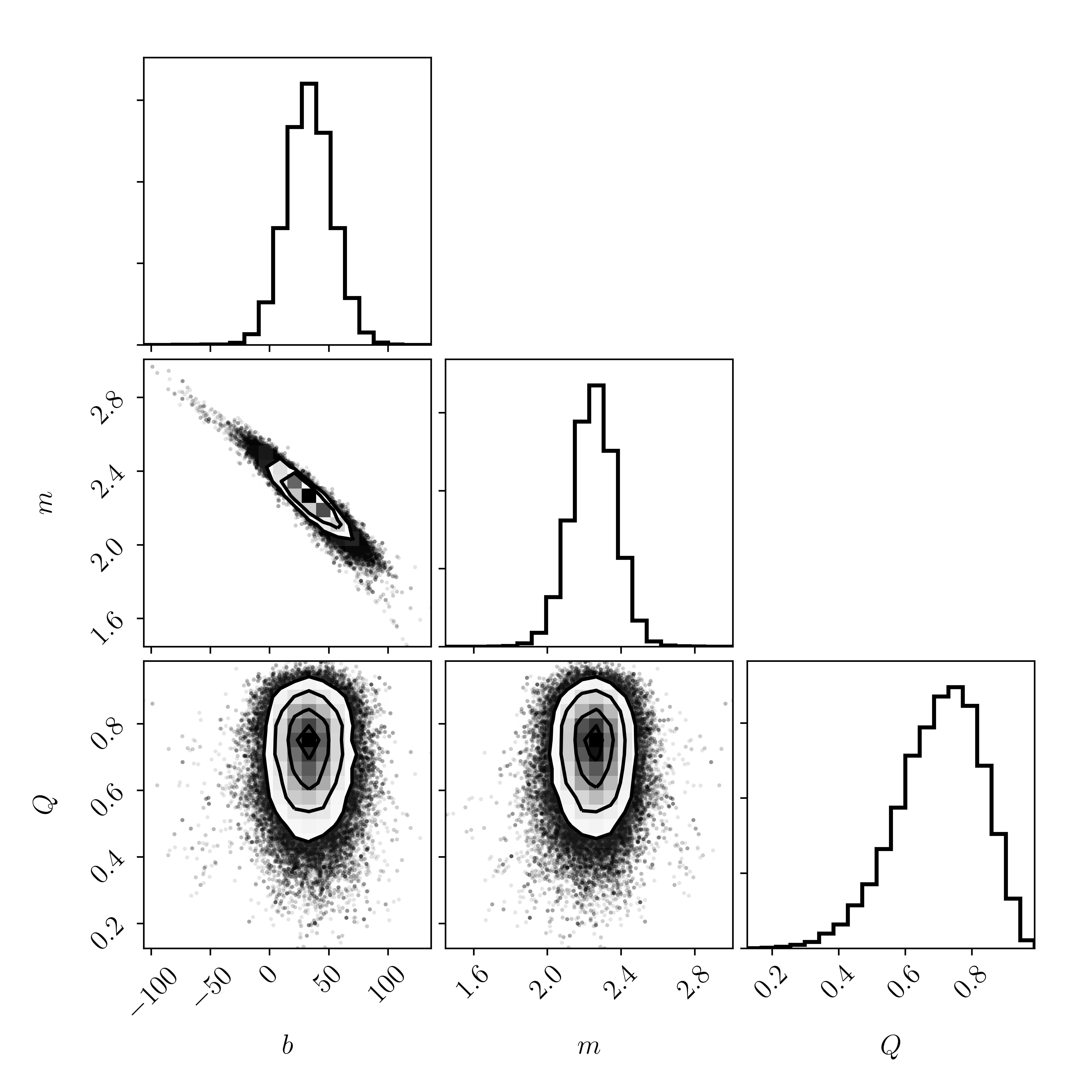 Where here we are only showing a `corner` plot for three of our parameters: \(m\), \(b\), and \(Q\). The parameters of the outlier distribution are so-called nuisance parameters, and we really only care about the marginalised likelihood of the line parameters \(m\) and \(b\), and to a lesser extent, the fraction of non-outliers \(Q\).