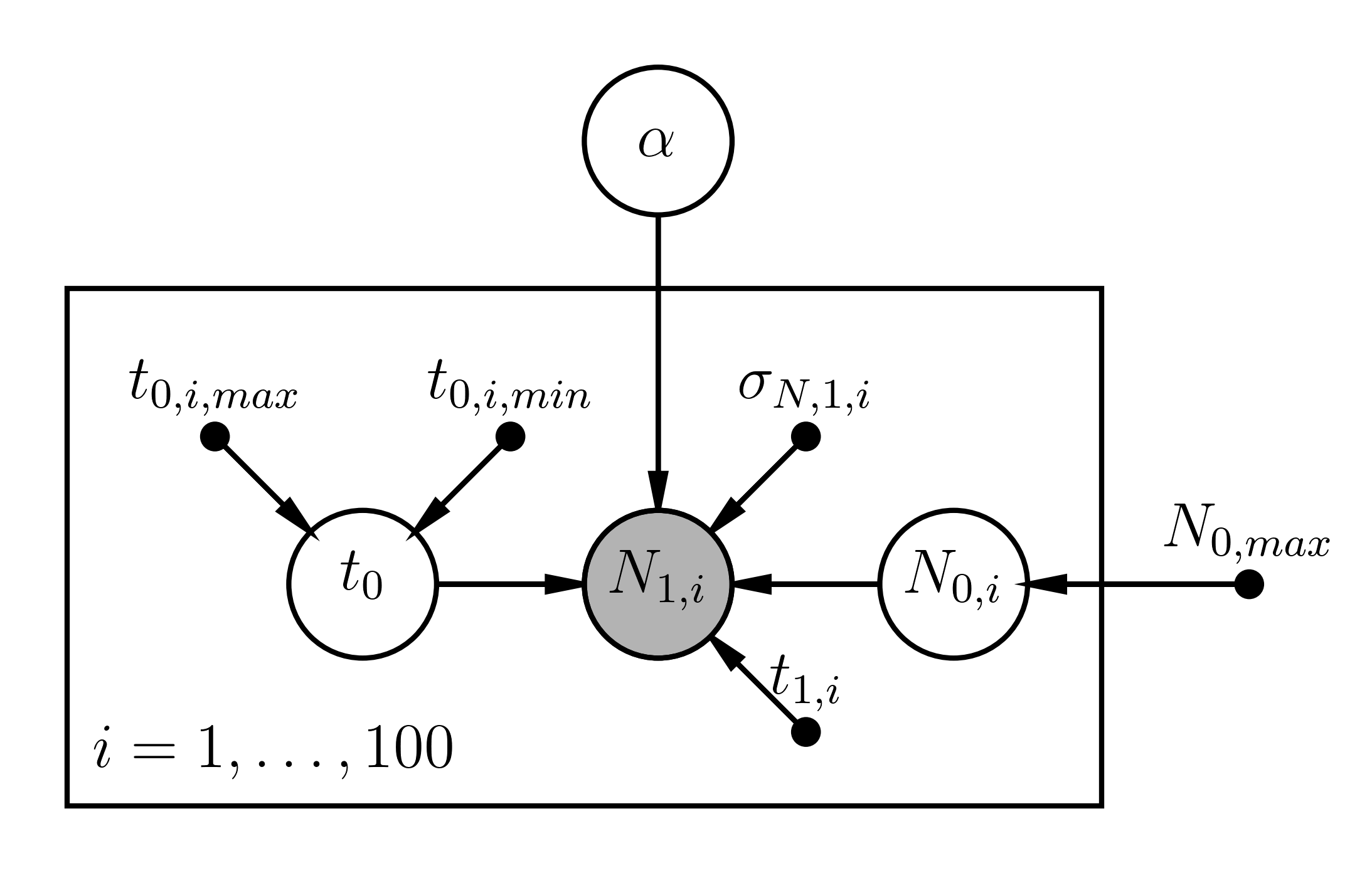 In a hierchical framework you would consider \(\alpha\) to be a Level 0 parameter in that it ultimately affects all your observations. You would then have the set of parameters \(\{\vec{t_{0}}, \vec{N_0}\}\) for all 100 widgets, where we only have a noisy estimate of each parameter. Indeed, for the initial amount of material for the \(i\)-th widget,