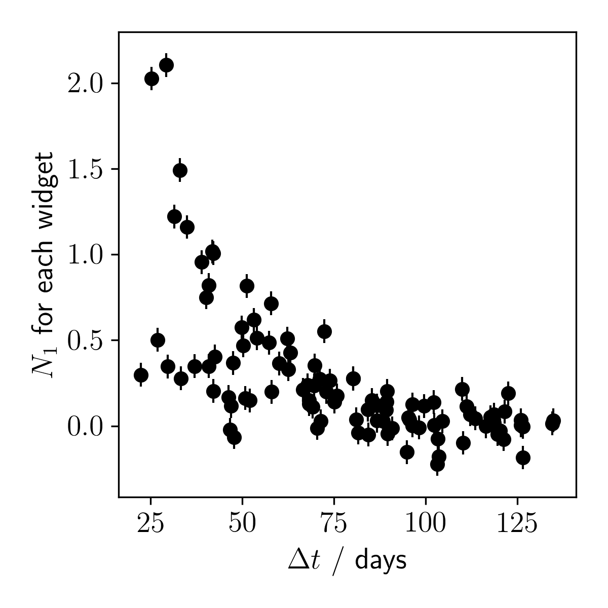 where \(N_0\) is the amount of material in the widget when it was manufactured at time \(t_0\). The time that the investigation team estimated the amount of material in a widget is very well known (\(t_1\)), but there are many unknown parameters here. The decay rate \(\alpha\) is what we are most interested in inferring, but for an individual widget we don't know how much material was in the widget when it was manufactured \(N_0\), or the exact time that it was manufactured \(t_0\). And while there were 100 widgets manufactured, we only have a single estimate of the amount of radioactive material present at some later time.