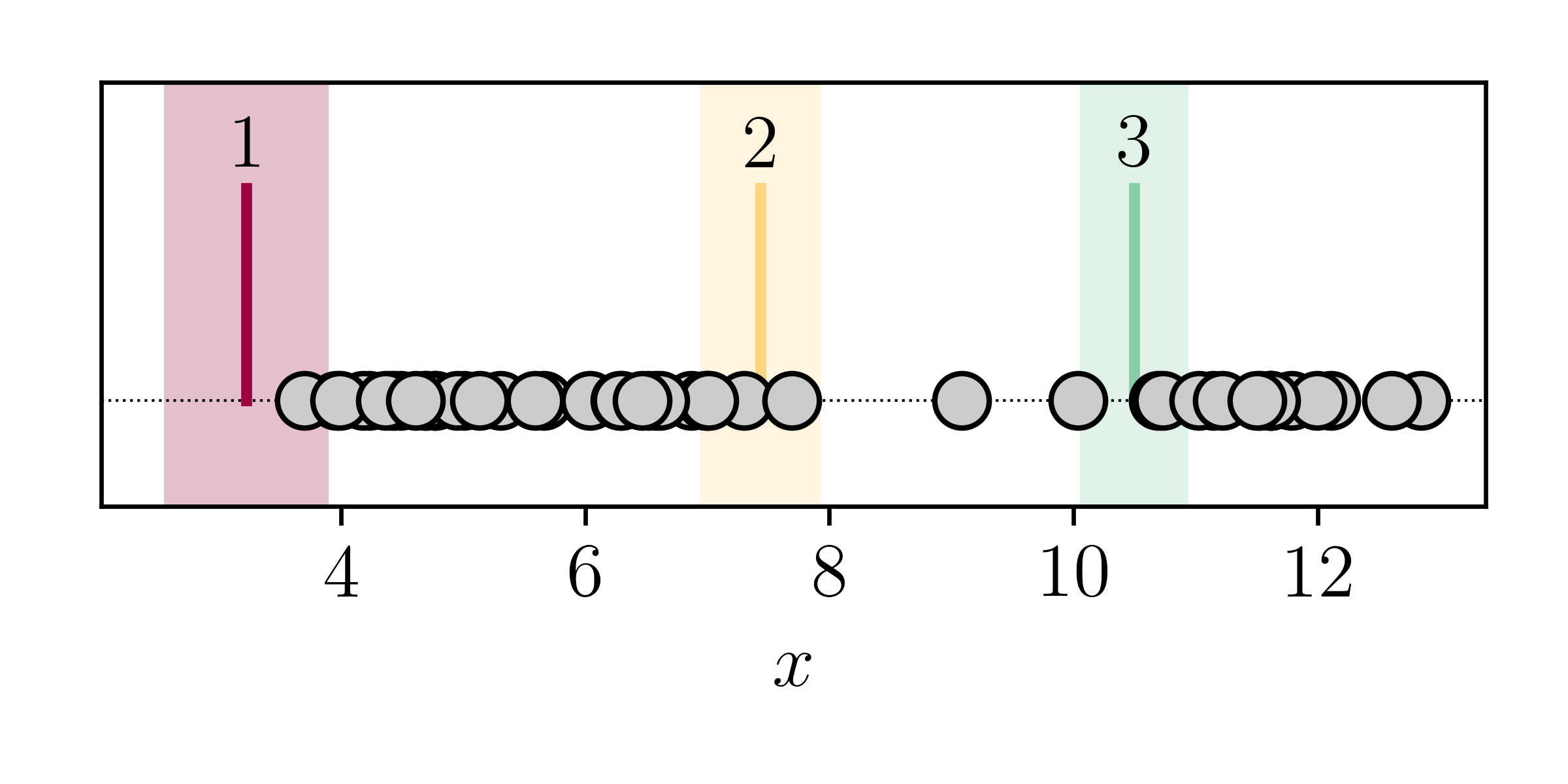 Let's say that these data are drawn from a mixture of three components, where each component is a Gaussian with some mean and some variance. We don't know what the means and variances are of any of the Gaussians. It is clear that if we were to treat this as a simple optimisation problem, there are a number of minima. For example, Component 1 could be the component with the mean and variance of the middle third of the data, or it could just as easily be the component describing the first third of the data. Or the last third!